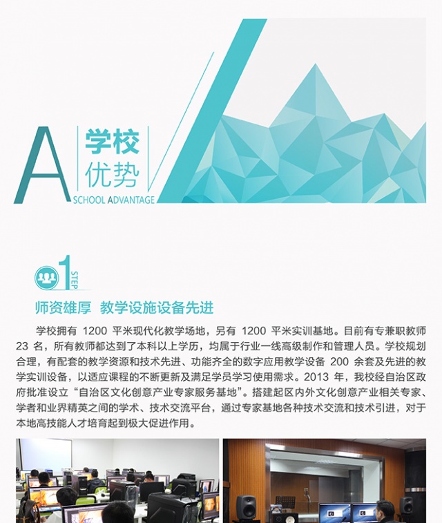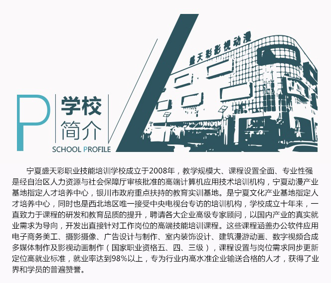 寧夏盛天彩職業(yè)技能培訓(xùn)學(xué)校是經(jīng)自治區(qū)人力資源與社會保障廳審核批準的寧夏地區(qū)成立最早、教學(xué)規(guī)模最大設(shè)置課程最全面、專業(yè)性最強的數(shù)字藝術(shù)培訓(xùn)機構(gòu),是銀川市政府重點扶持的動畫教育實訓(xùn)基地,寧夏文化創(chuàng)意產(chǎn)業(yè)基地指定人才培養(yǎng)中心,也是西北地區(qū)唯一接受中央電視臺專訪的高技能人才培育機構(gòu)。