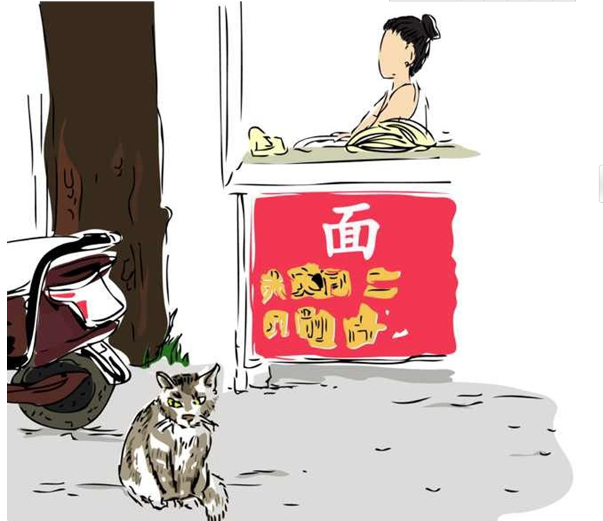 道北村中的一家面食店,店主在制作新鮮的面條,小貓?jiān)跇?shù)蔭下乘涼